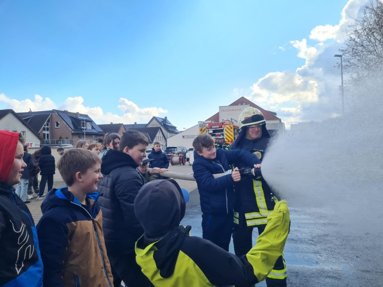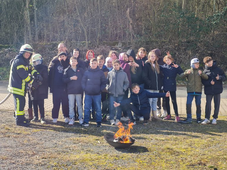 Im Frühjahr bekam die Klasse 5 Forschung im Rahmen einer Unterrichtsreihe zum Thema Feuer und Brände eine besondere Gelegenheit. Die Feuerwehr Barsinghausen öffnete für die Schülerinnen und Schüler ihre Halle und die Kinder bekamen die Möglichkeit, sich einmal hautnah über die Aufgaben und Abläufe dort zu informieren. Gleich mehrere Mitglieder der Freiwilligen Feuerwehr nahmen sich die Zeit, um Fahrzeuge vorzuführen, Geräte zu zeigen und Fragen zu beantworten. Anschließend durften die Kinder selber Hand anlegen und Übungsbrände löschen. Ein Highlight war zweifellos die Fahrt im Korb der nagelneuen Drehleiter.